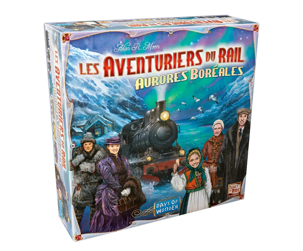 Aurores Boréales est une nouvelle version du célèbre jeu d’aventures ferroviaires. Les joueurs utilisent leurs cartes wagon pour prendre possession de voies ferrées ou embarquer à bord d’un ferry, reliant peu à peu les villes qui figurent sur leurs tickets.
