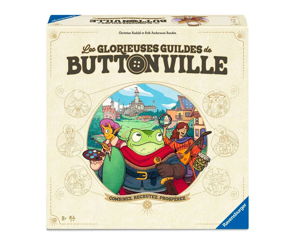 Les Glorieuses Guildes de Buttonville est un jeu de cartes pour 2 à 4 joueurs. Chaque joueur doit recruter des Villageois aux capacités uniques et former des sets pour maximiser leurs effets et marquer le plus de points de gloire.